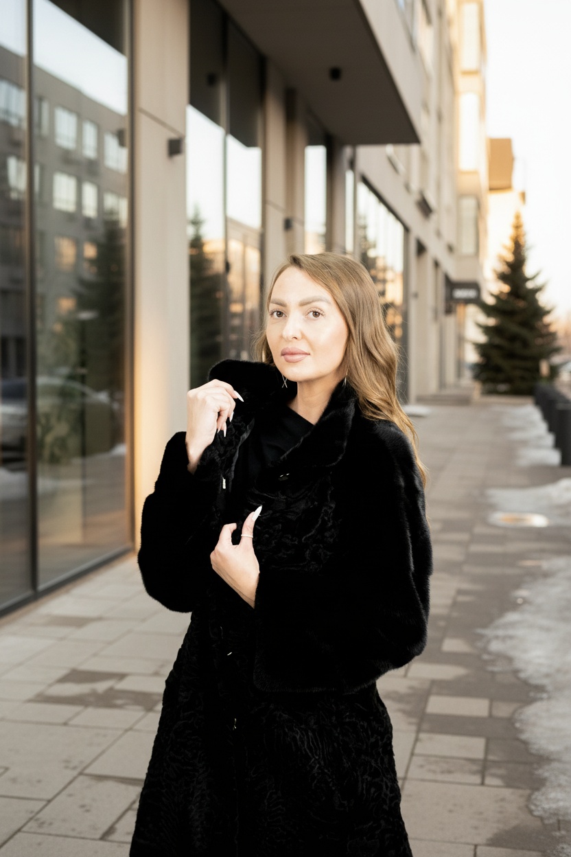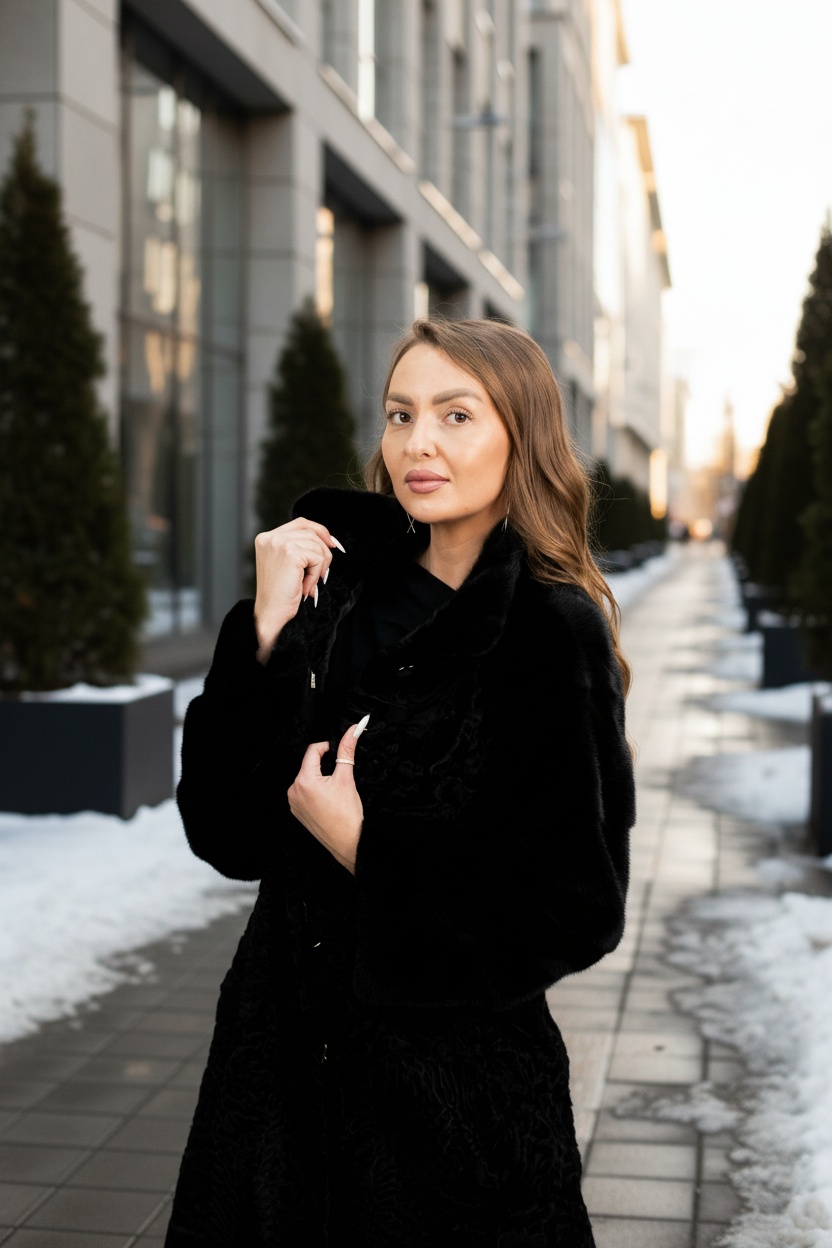 Каракулевая шуба в стиле Афган. Тонкий завиток свакара, контрастная отделка, приталенный силуэт.