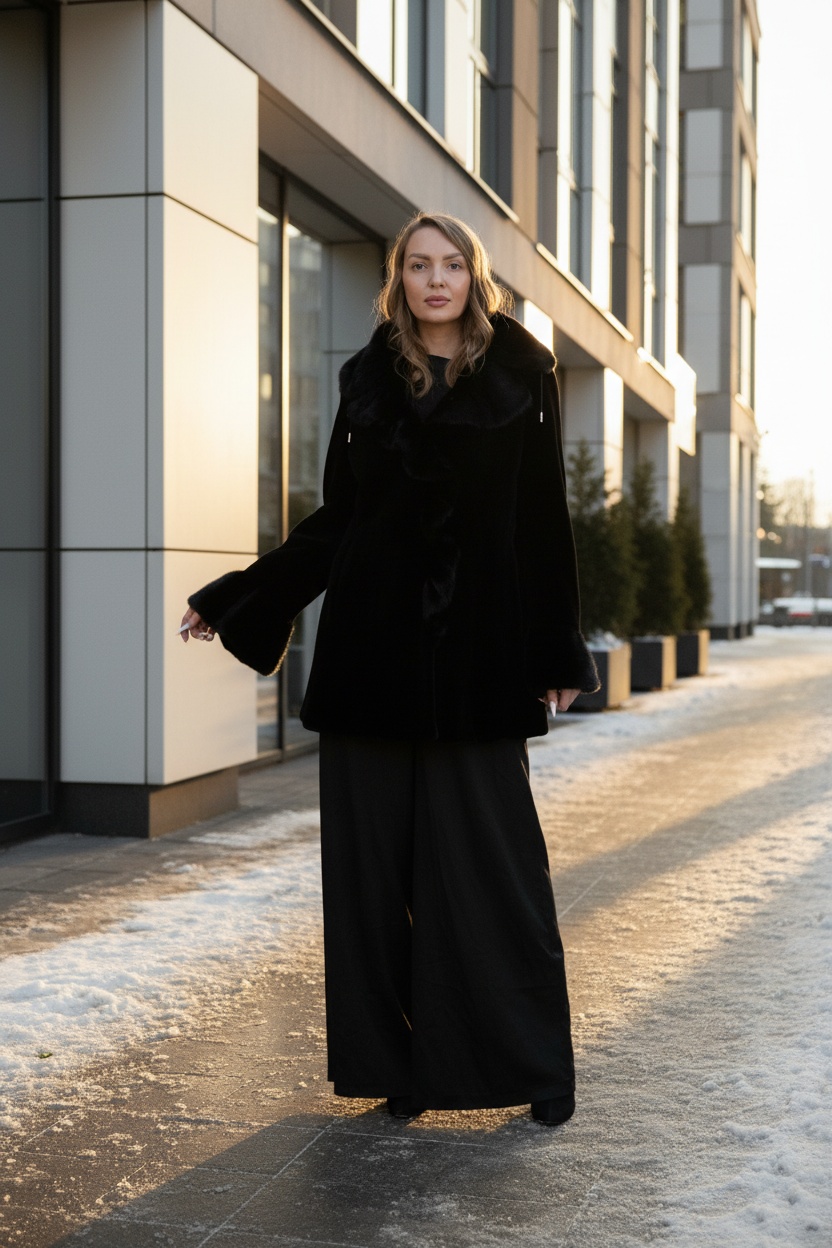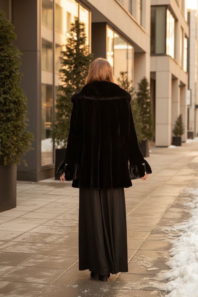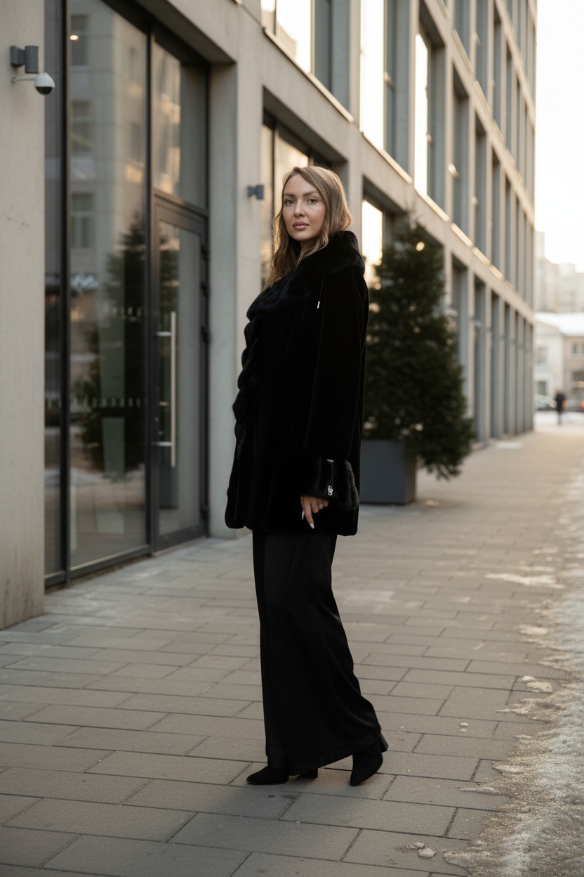 Шуба из скандинавской норки. Глубокий чёрный цвет, поперечная раскладка меха, приталенный силуэт.