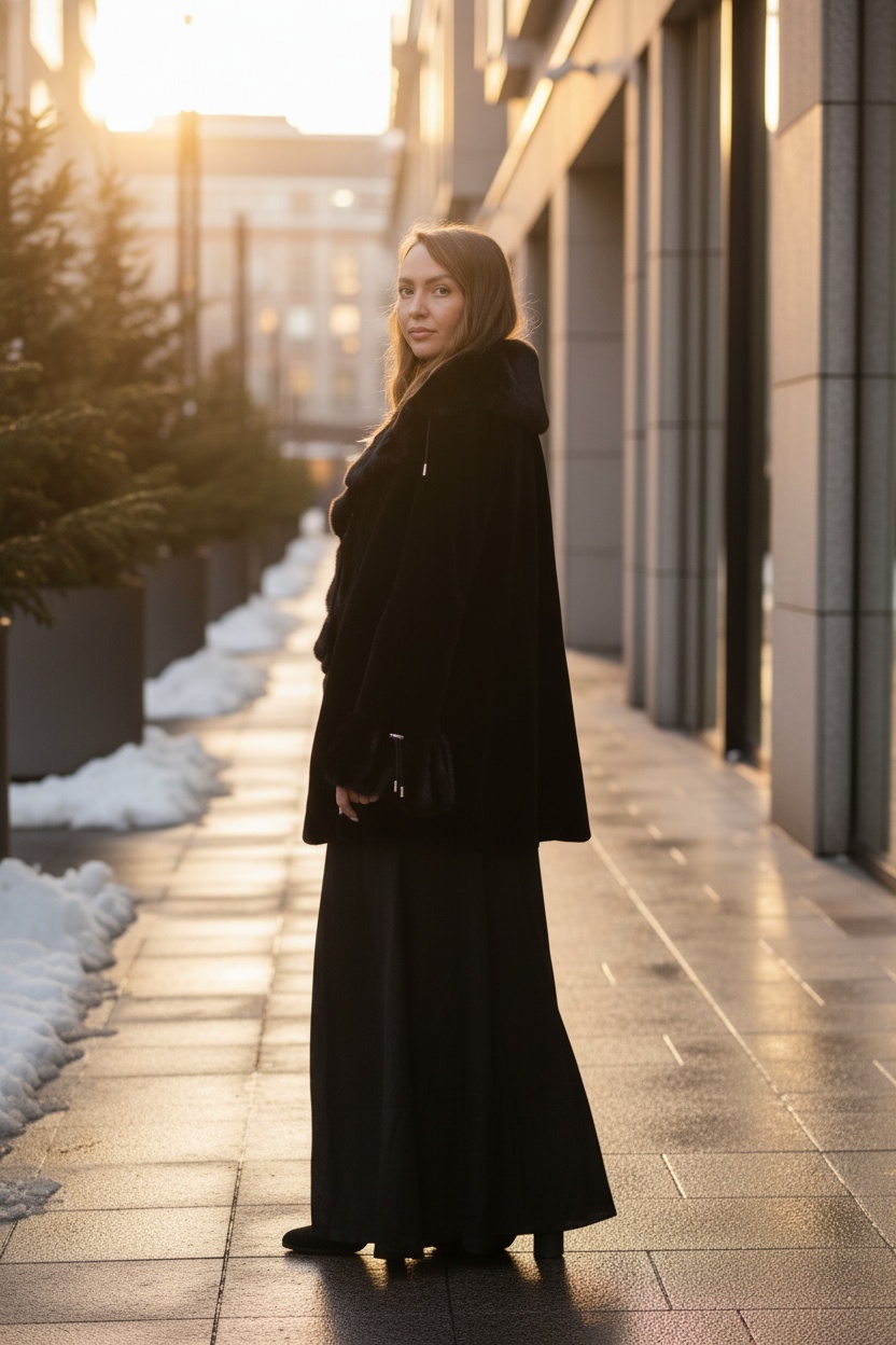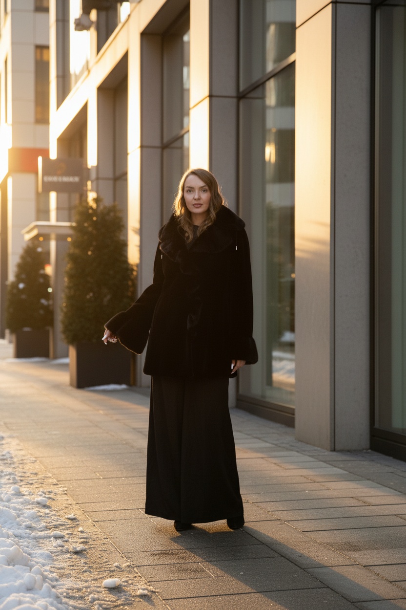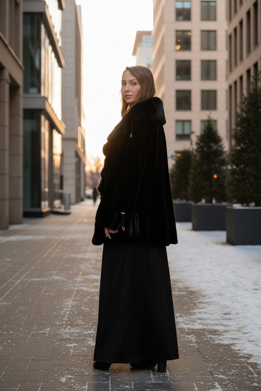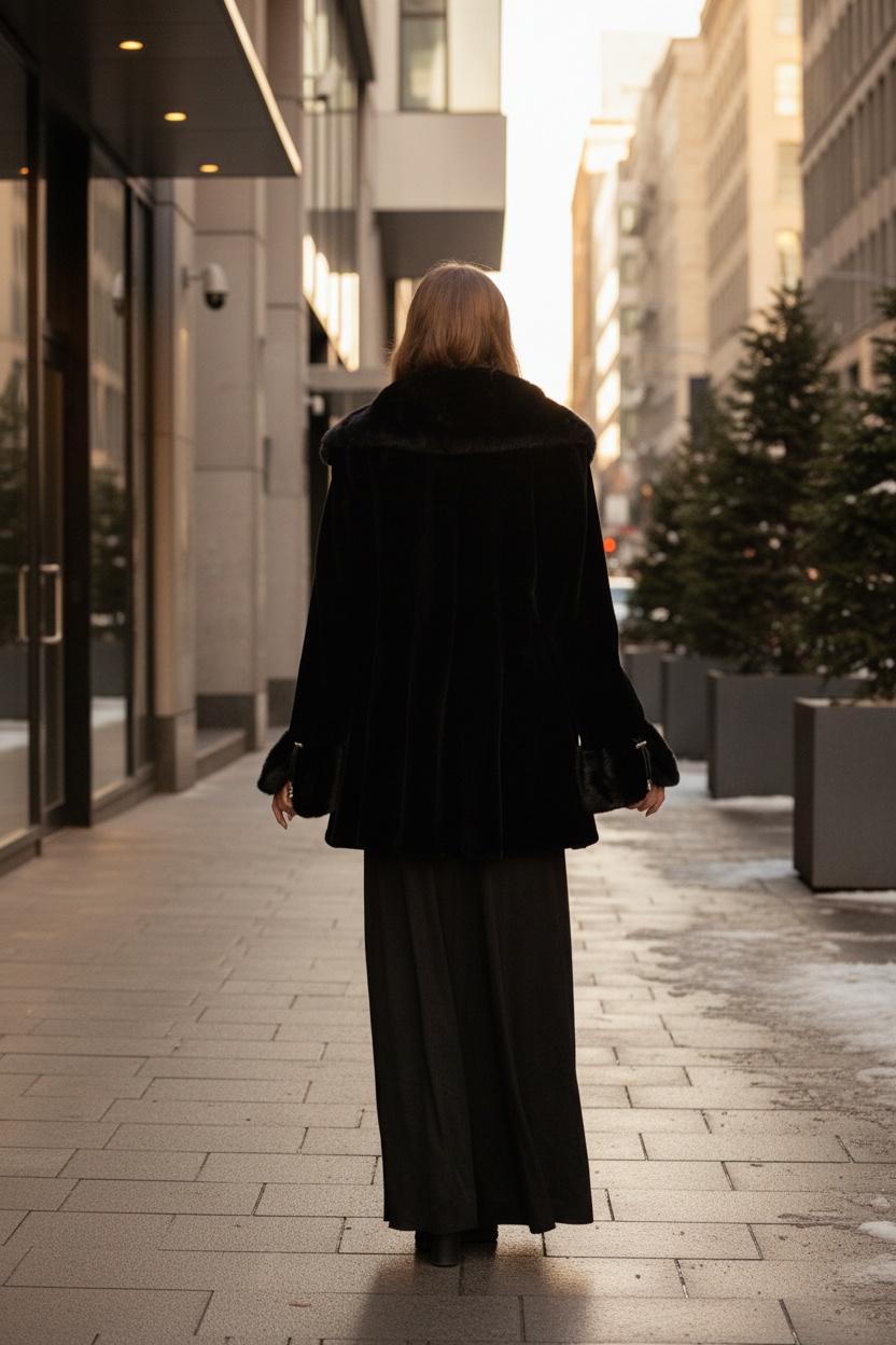 Шуба из скандинавской норки. Глубокий чёрный цвет, поперечная раскладка меха, приталенный силуэт.