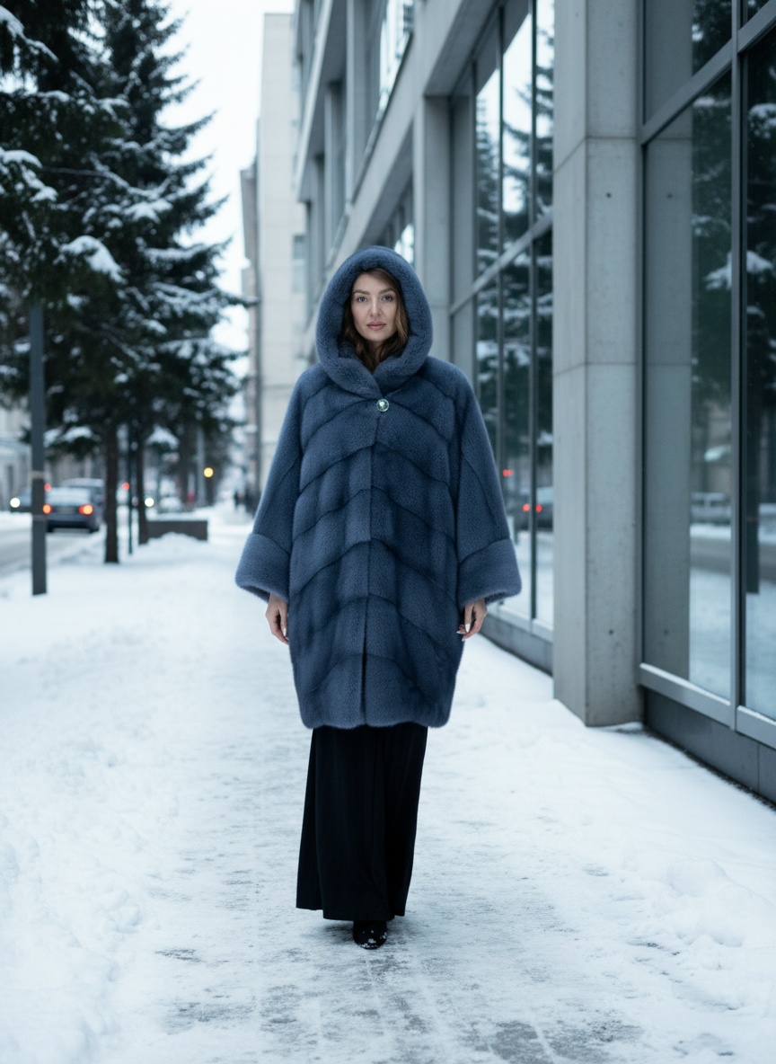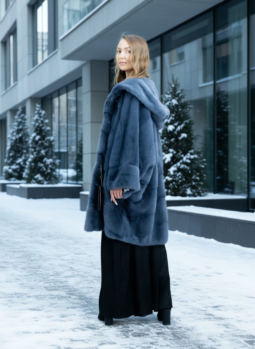 Шуба-кимоно из норки в оттенке Blue Jeans. Нестандартный крой, лёгкость и свобода движений.