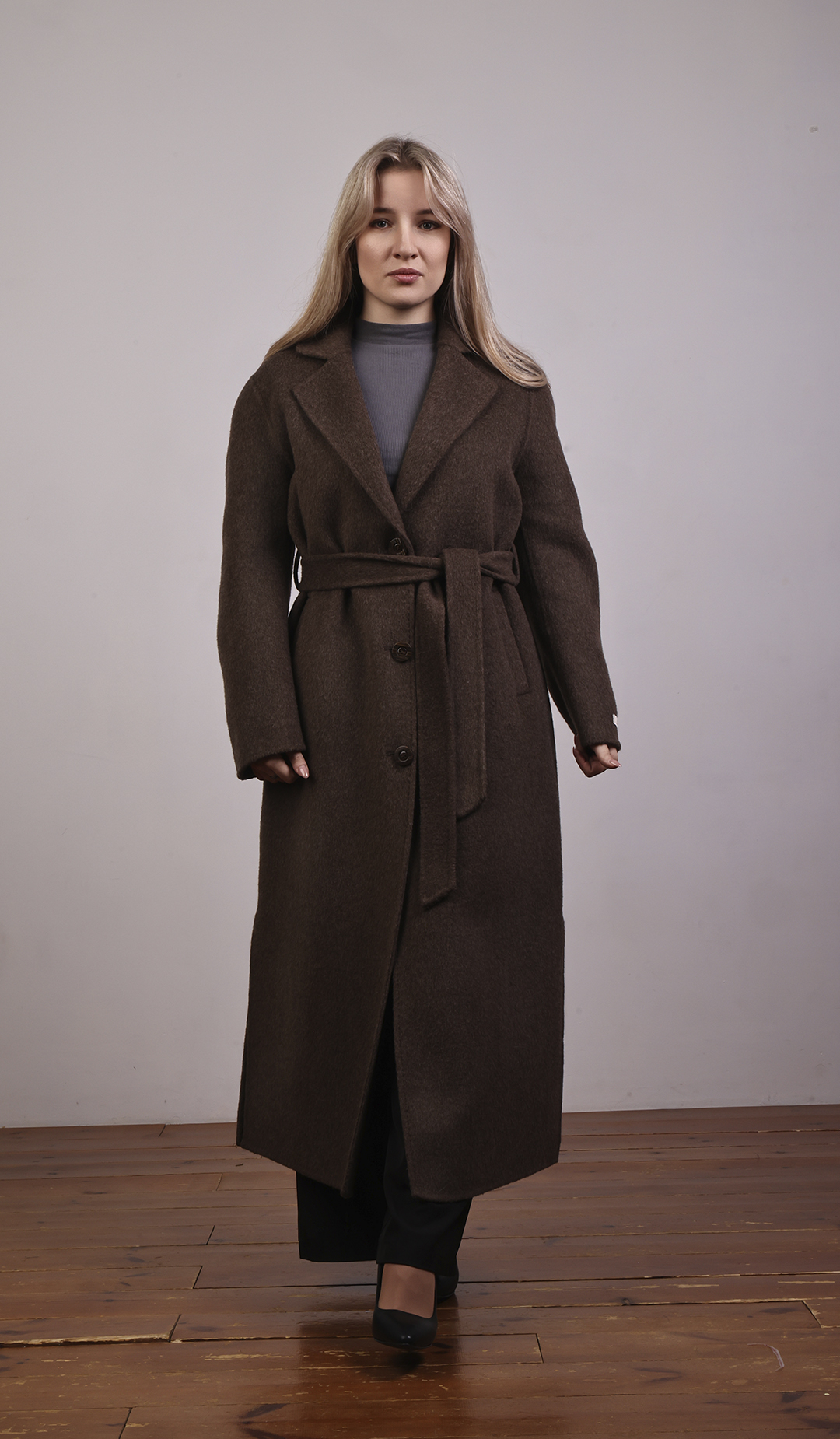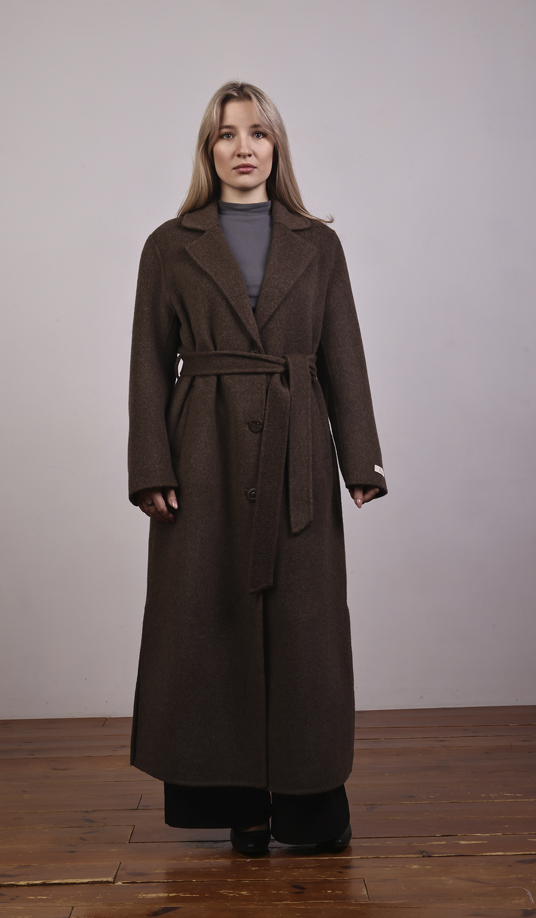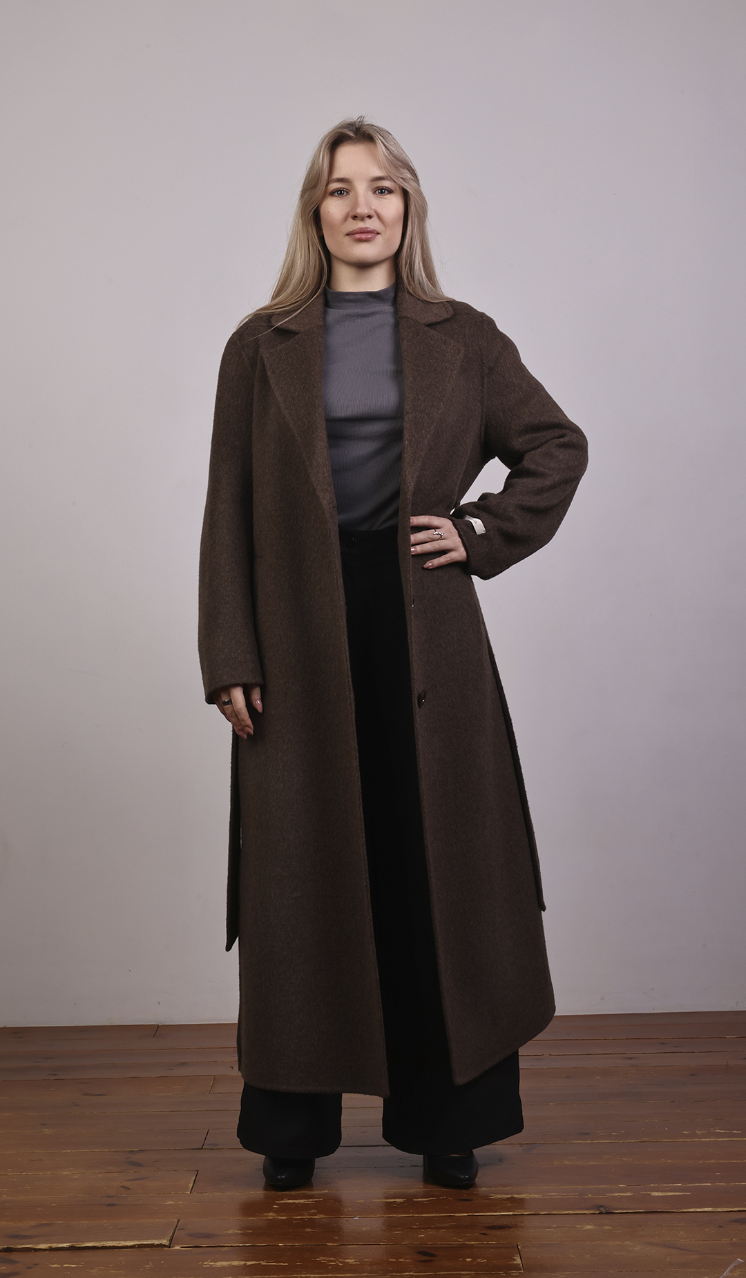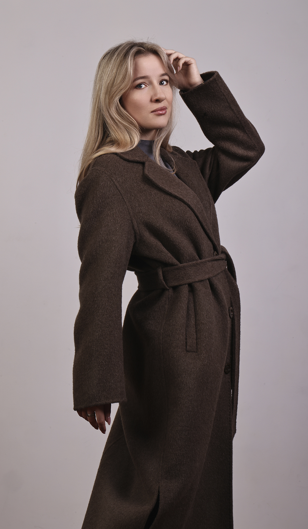 Пальто-халат с запахом. Мягкие линии, свободный силуэт, объёмный пояс.