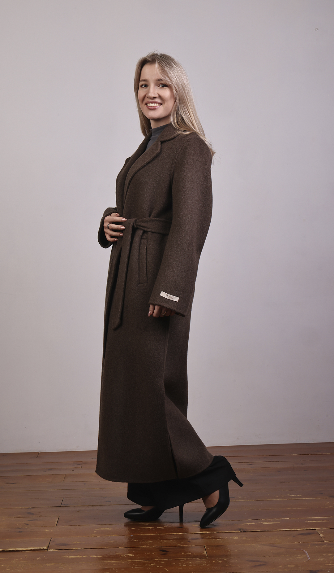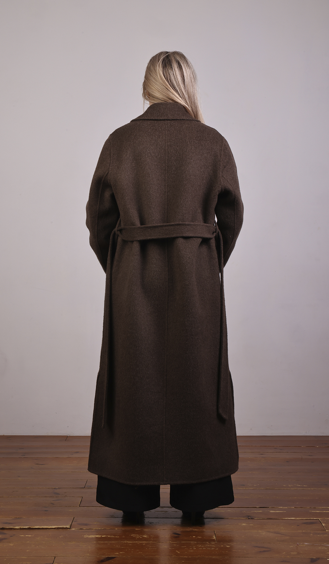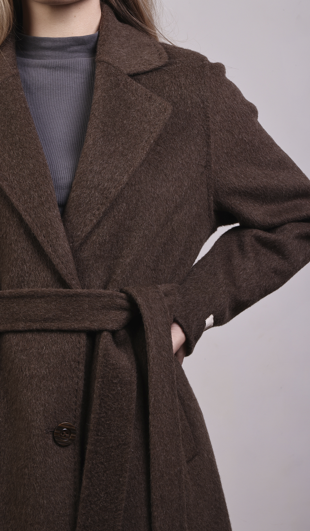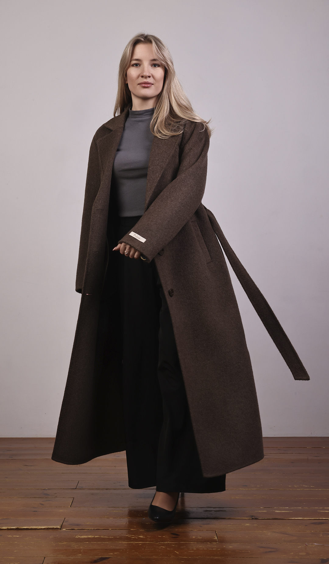 Пальто-халат с запахом. Мягкие линии, свободный силуэт, объёмный пояс.