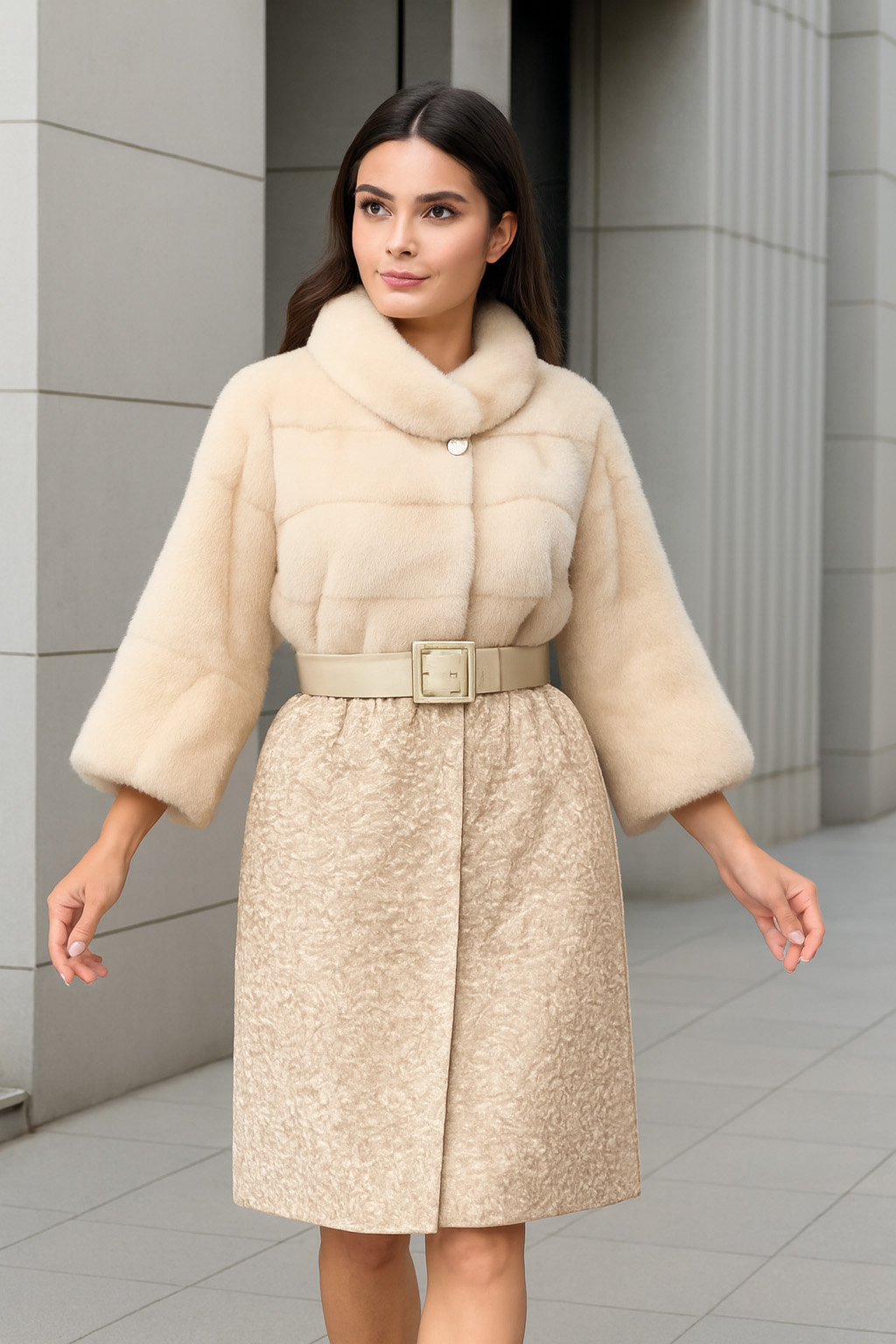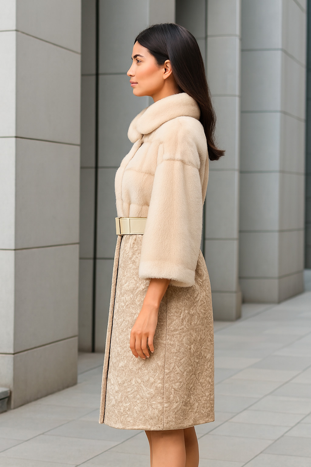 Комбинированное пальто из норки бежевого цвета с поясом. Утончённый дизайн.