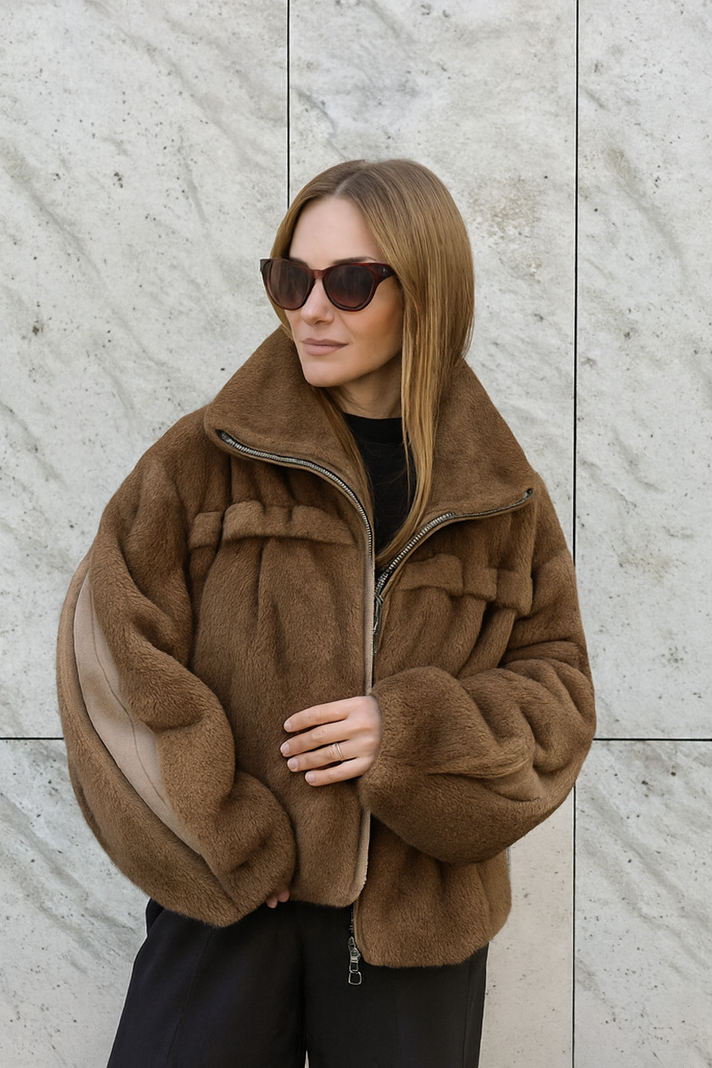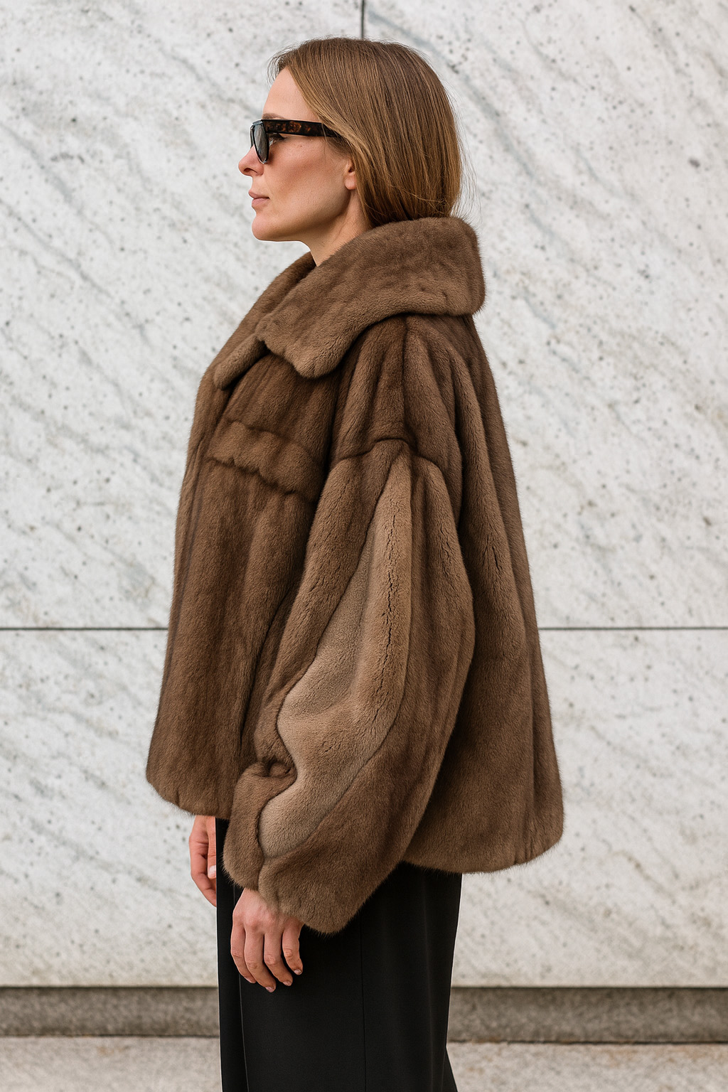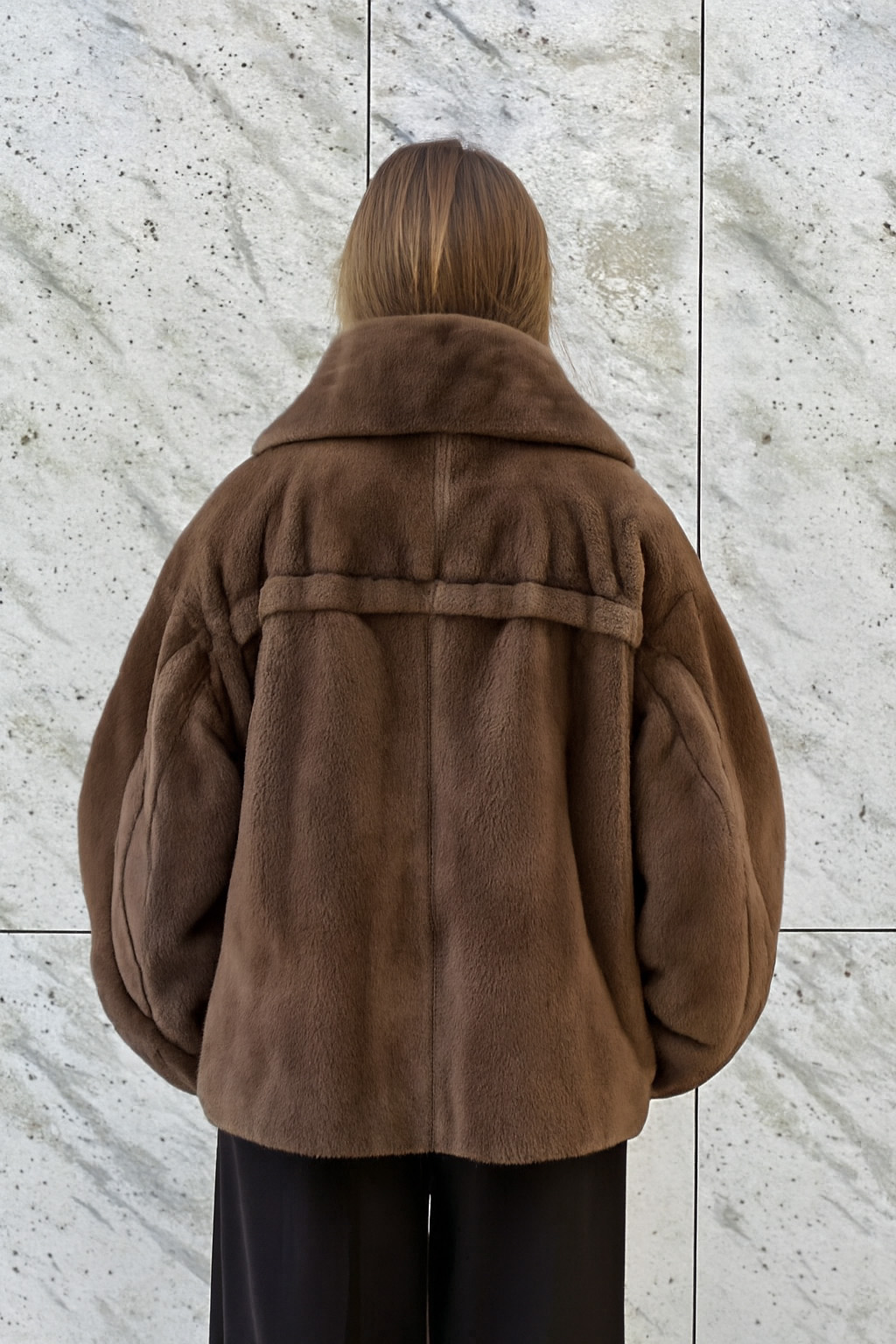 Полушубок из норки коричневого оттенка. Свободный крой оверсайз, объёмный силуэт.