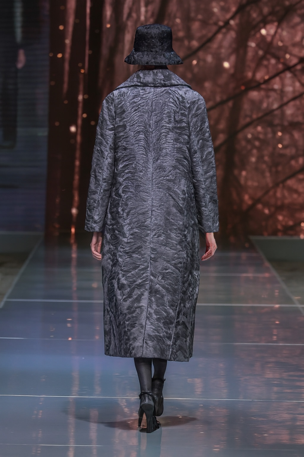 Шуба из каракуля серого цвета в стиле оверсайз. Современный силуэт, подиумный крой.
