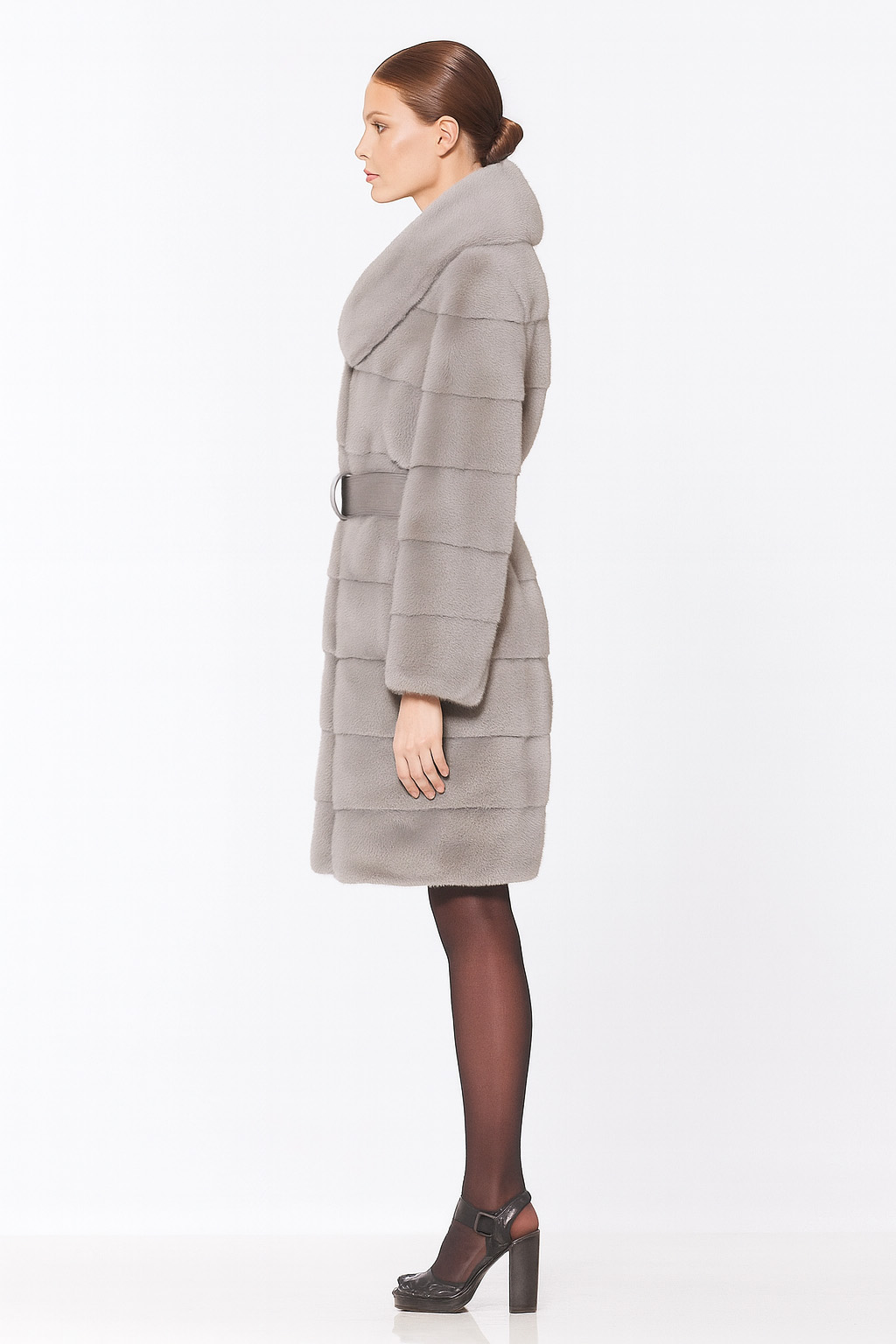 Шуба из норки светло-серого оттенка с поясом. Мягкий цвет, женственный силуэт.