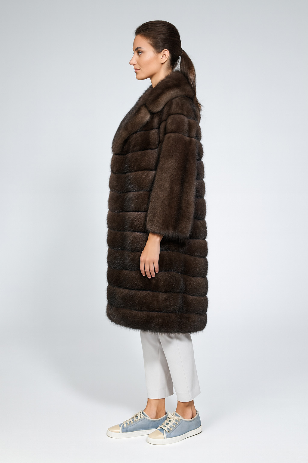 Роскошная шуба из соболя глубокого тёмно-коричневого оттенка. Длинный силуэт, безупречный мех.