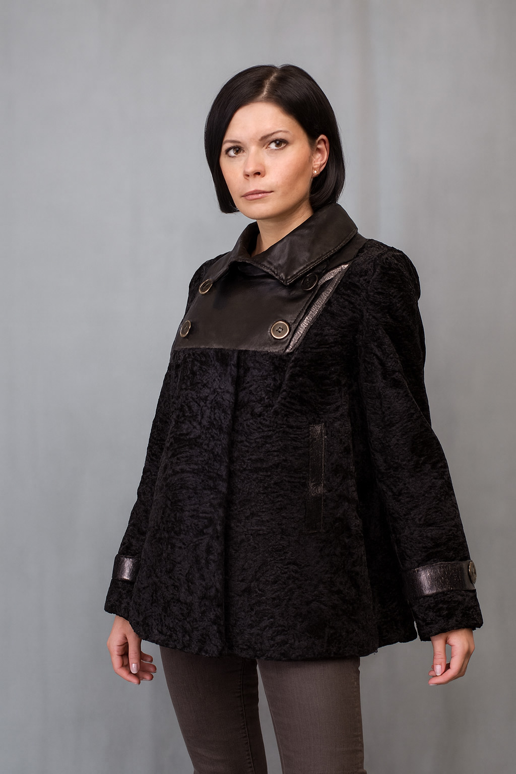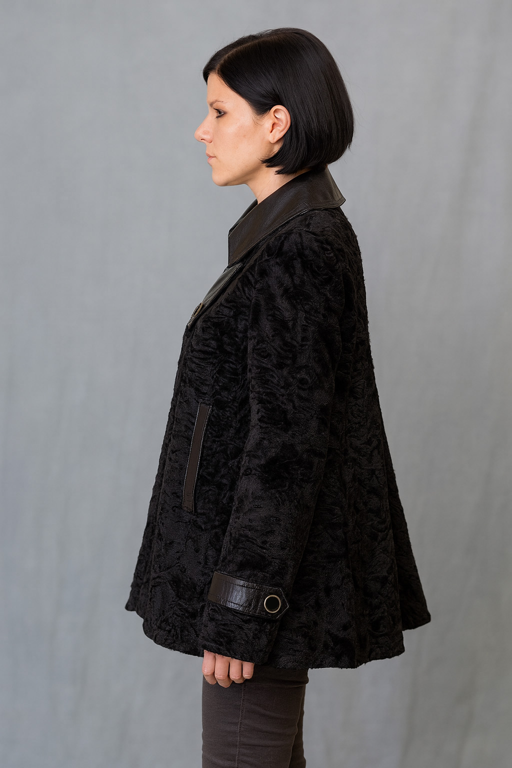 Жакет из каракуля чёрного цвета с кожаным воротником. Строгий городской стиль.