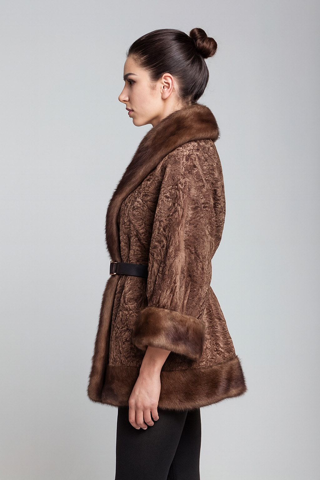 Жакет из каракуля коричневого цвета с отделкой из норки и поясом. Авторский дизайн.